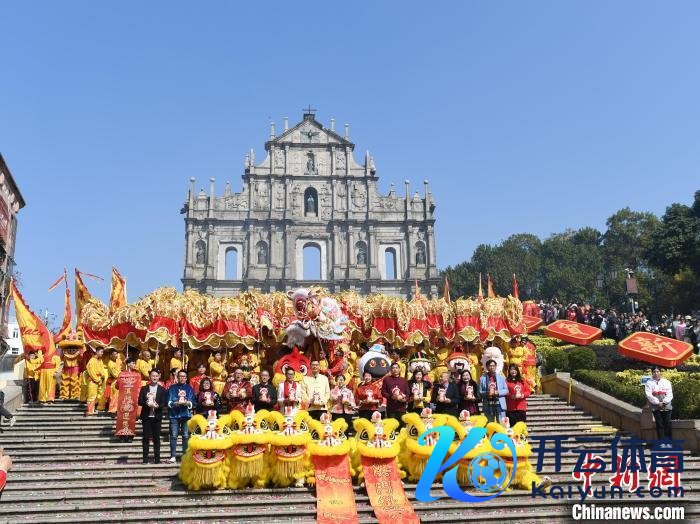 1月29日,澳门特区政府旅游局在大三巴牌楼前举行“闲隙春节——2025年龙腾舞跃贺新春”社区巡演活动,与市民、游客欢度新春。图为主礼嘉宾与巡演的大金龙、醒狮等在大三巴牌楼前合影。 中新社记者 郑嘉伟 摄