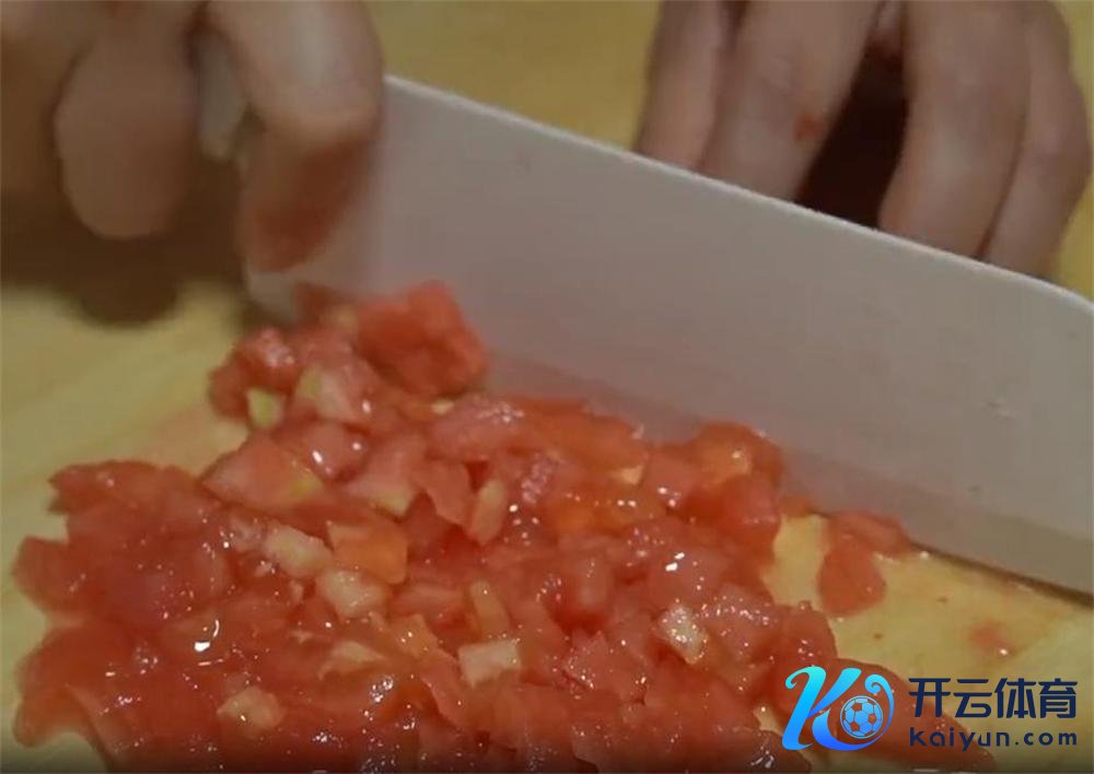 4.烫好的西红柿剥去外表,然后用刀切碎成小丁儿,这么炒的本领容易出汁。