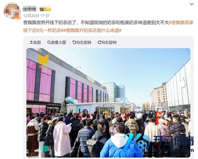 12月20日,有网友在外交平台发文称,香飘飘在浙江杭州开出了首家线下奶茶店。同日,#香飘飘首家线下店9元一杯奶茶#话题登上微博热搜。据网友拍摄的图片,现场东谈主声烦躁,宽敞杭州市民前往大开。