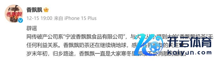 随后香飘飘 (香飘飘食物股份有限公司)发辟谣微博:网传歇业公司系“宁波香飘飘食物有限公司”,与民众从小喝到大的“香飘飘奶茶”无任何利益相干。香飘飘奶茶还在持续绕地球,感谢各界一又友的存眷。