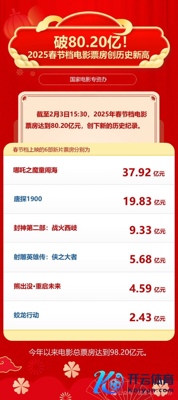 新京报贝壳财经讯据国度电影专资办数据表现九游体育娱乐网,鸿沟2月3日下昼3时30分,2025年春节档电影票房已达到80.20亿元,创历史新高。鸿沟当今,2025年总票房已达98.20亿元。