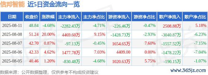 本站讯息,界限2025年8月11日收盘,信邦智能(301112)报收于48.84元九游体育app(中国)官方网站,着落4.68%,换手率9.0%,成交量9.93万手,成交额4.85亿元。