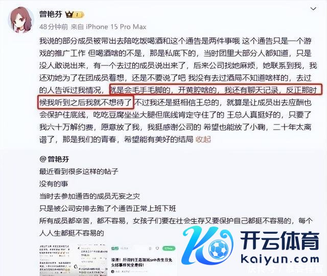 曾艳芬说,2014到2017年丝芭传媒融资技艺,曾安排部分女艺东说念主投入商务饭局,这些饭局和正常告示无关,齐是暗里安排,席间投资方还有“毛手毛脚”“开黄腔”等不当当作。 她还暗意我方持有聊天记载等把柄。
