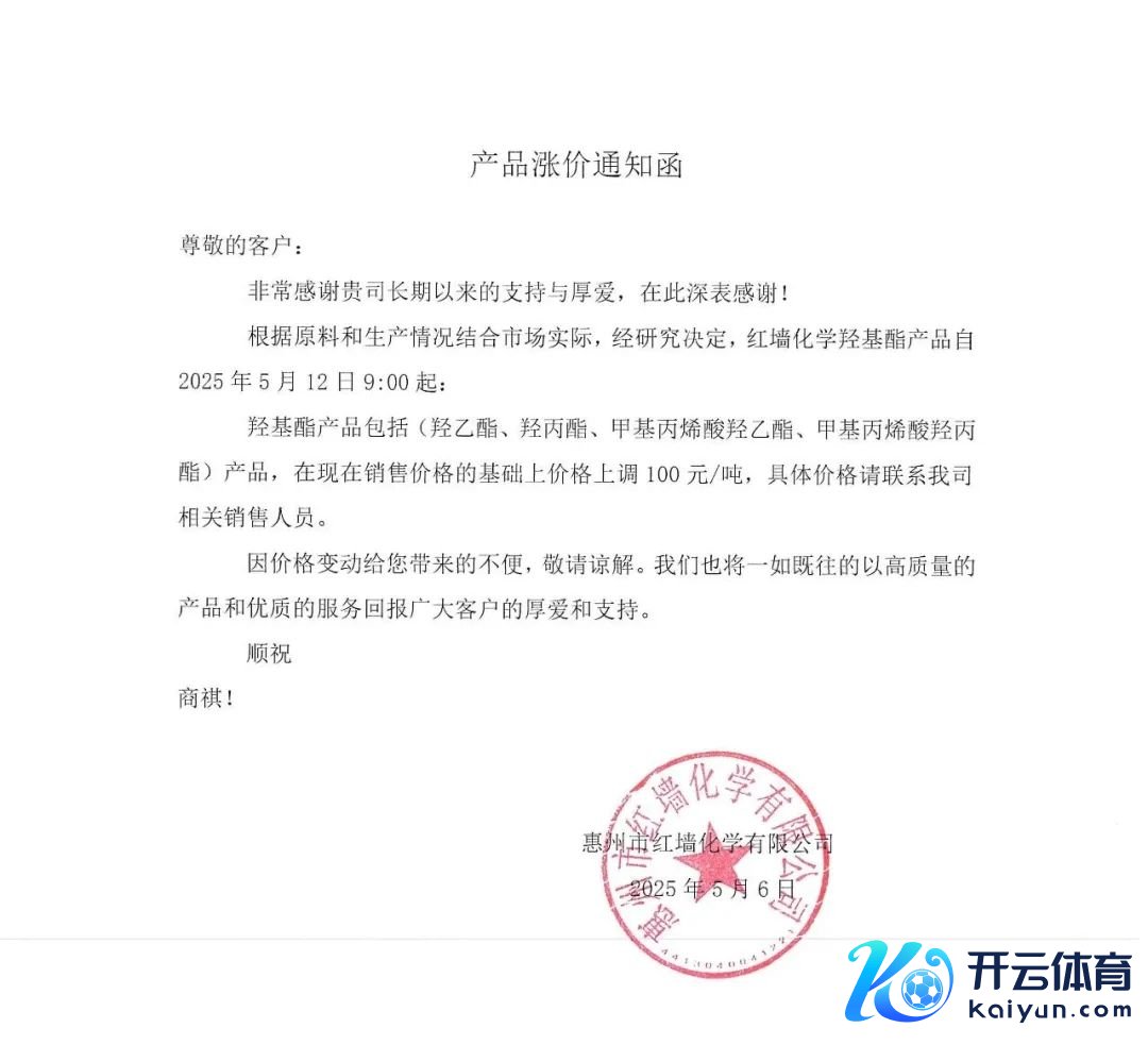 红墙股份发布羟基酯产物加价示知函红墙股份发布羟基酯产物加价示知函