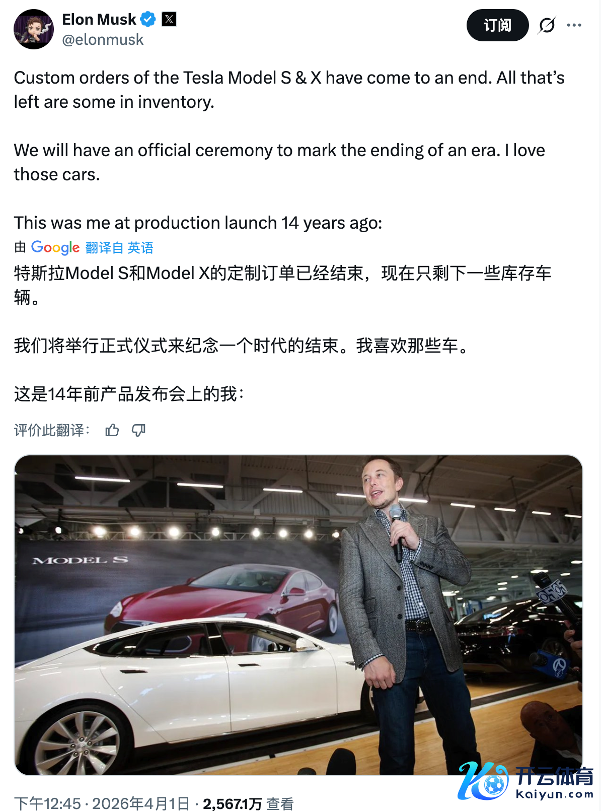“特斯拉Model S和Model X的定制订单已收尾。当前仅剩极少库存车。咱们将举办一场官方典礼,驰念一个期间的遣散。我疼爱这两款车型。这是14年前我在投产发布会上的像片。”马斯克称。